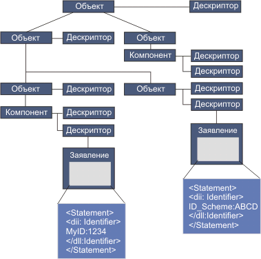 Несколько элементов в декларации цифрового объекта могут содержать нуль один или более дескрипторов. Каждый Descriptor может содержать одно заявление, которое может содержать один идентификатор, относящийся к составляющему элементу заявления. На рис. 2 для идентификации компонента и объект используются два заявления (левая часть диаграммы) и (правая часть диаграммы).